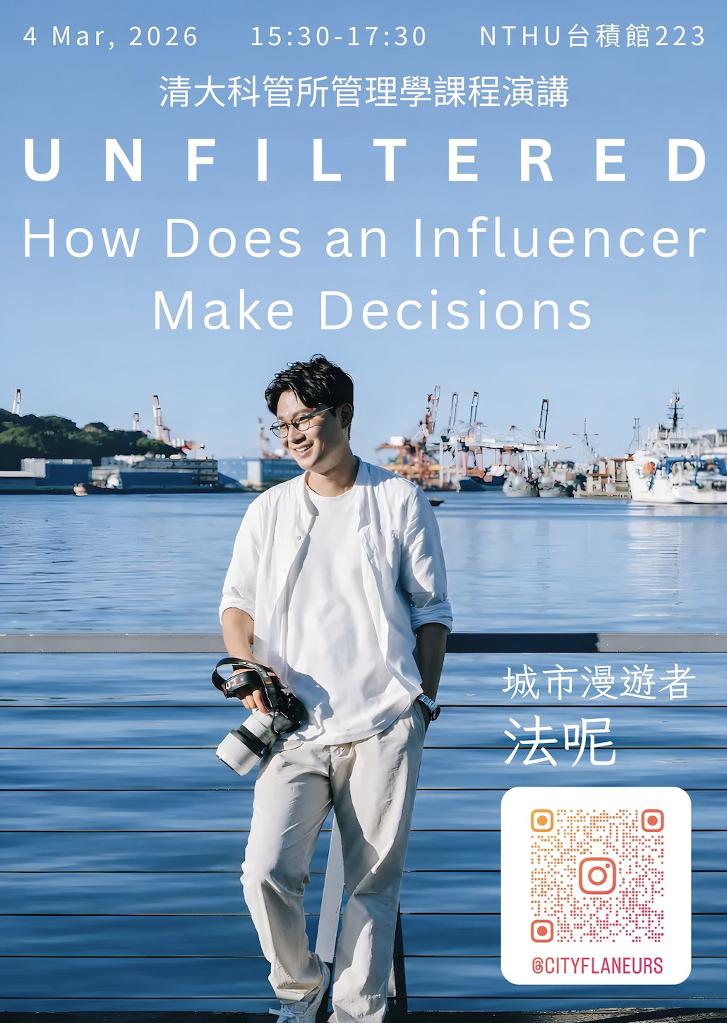 活動時間|2026年3月4日 (三) 15:30 - 17:30 活動地點|國立清華大學 台積館 223 教室 活動內容|當管理學遇上自媒體,決策的邏輯會有什麼不同?本次演講特別邀請知名創作者「法呢」,與同學分享在社群浪潮下,Influencer 如何運用管理思維做出關鍵決策。